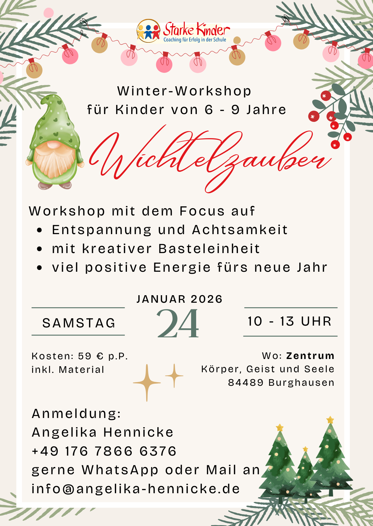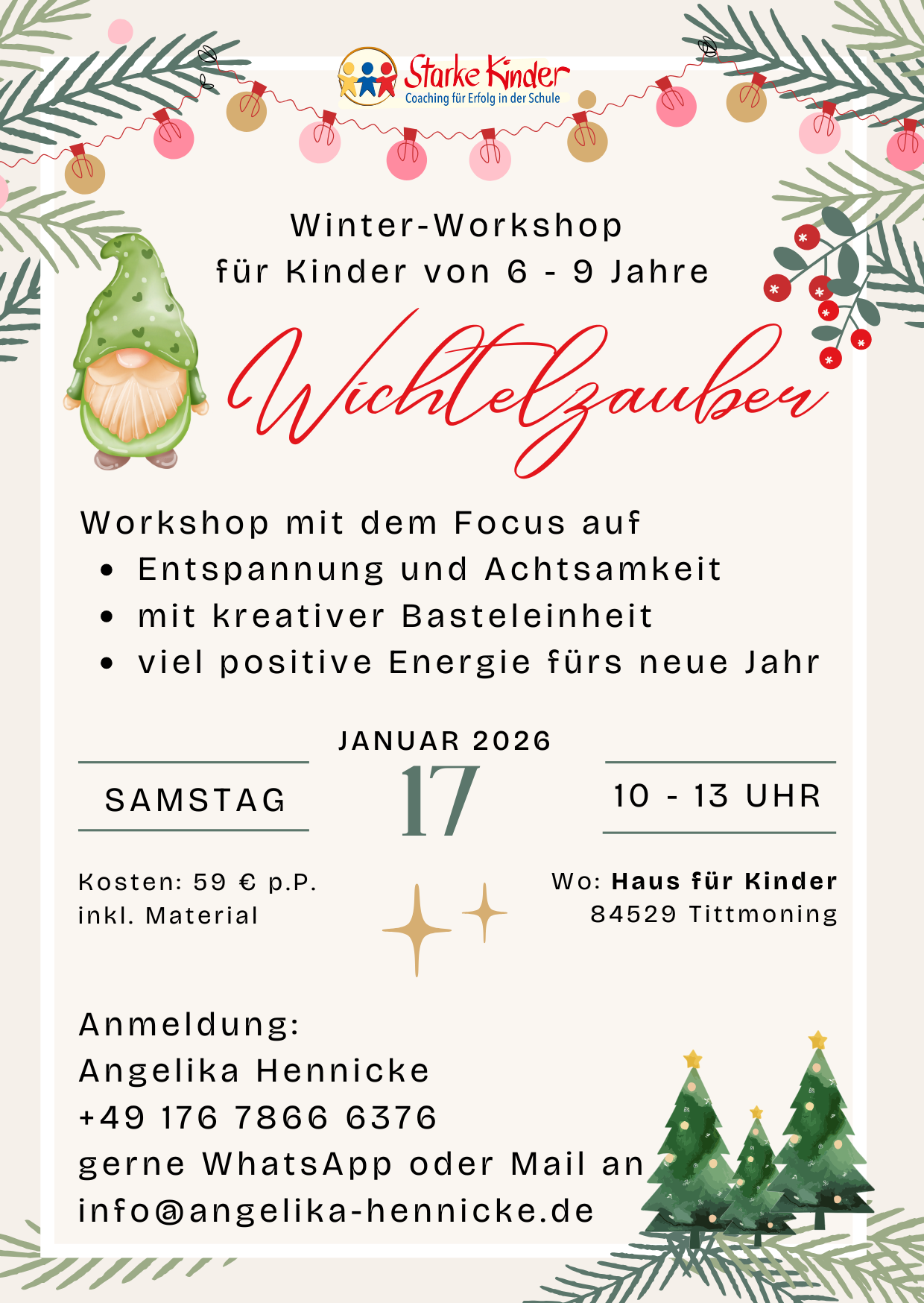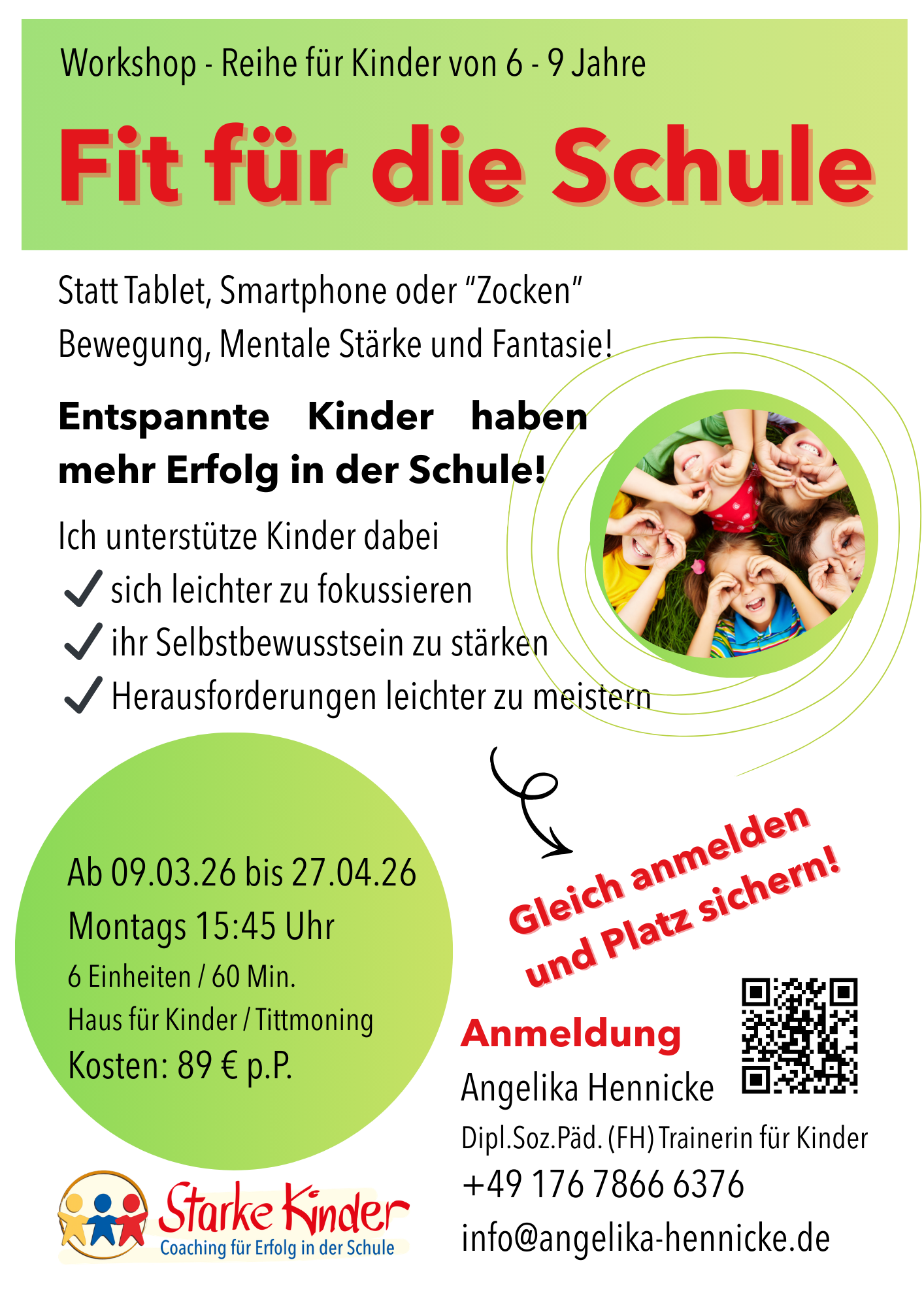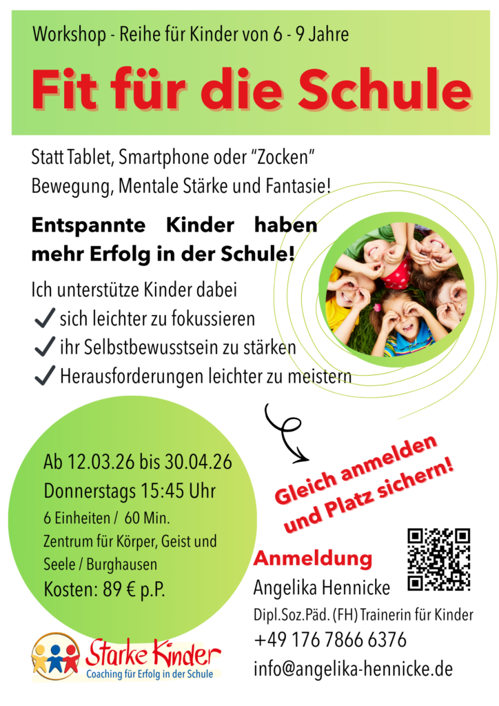 Die individuelle Begleitung und Unterstützung von Angelika haben meinem Kind sehr geholfen. Die situationsorientierte Arbeit war gut auf die Bedürfnisse meines Kindes abgestimmt, und es wurde stets kindgerecht und einfühlsam begleitet. Besonders positiv hervorzuheben ist die freundliche und motivierende Atmosphäre, in der mein Kind sich wohlgefühlt hat. Meine Tochter hat mit Freude teilgenommen und wertvolle Impulse für ihre mentale Stärke erhalten.